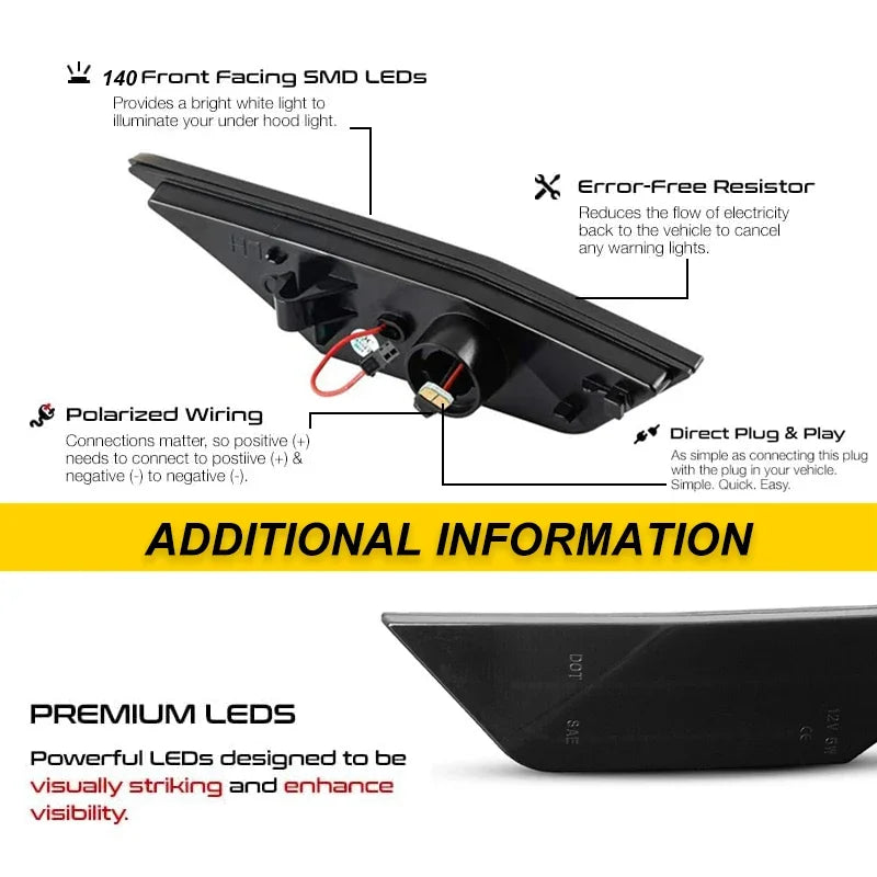 Each package includes (2) LED side lamps to fit for the front of a 16-21 Honda Civic. Each side marker is powered by 74 pieces super bright amber Sequential Turn Signal LED chips and 74 pieces super bright white Parking Lamp/DRL . Use this pair of LED side marker lights to easily replace your Civic's OEM side marker lights for a much brighter and noticeable look. The enhanced brightness elevates your Honda Civic's presence and aura by adding additional safety and visibility features, while increasing its visual appeal.