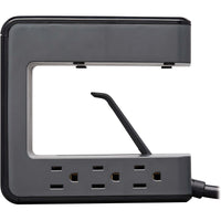 This portable surge protector features a spring-loaded clamp that attaches to any flat, smooth surface up to 2.5 inches (6.4 centimeters) thick, so you can take it with you to the office, dorm, conference room, hotel or anywhere else you need to plug in your electronic devices. The eight-foot power cord with NEMA 5-15P plug pivots 90 degrees to accommodate installation to a horizontal or vertical surface.