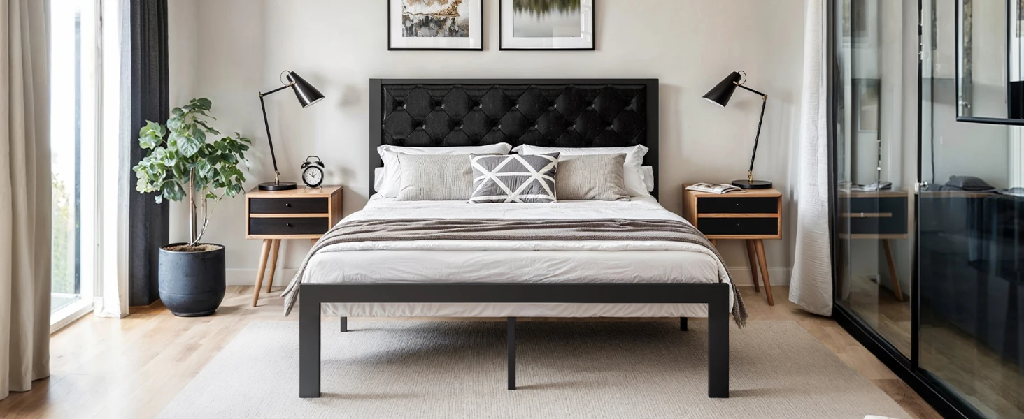 Classic Look & Sturdy Structure: The metal bed frame is designed with a robust structure, ensuring long-lasting durability and reliability, while the upholstered finely stitched headboard adds a touch of elegance to your bedroom decor