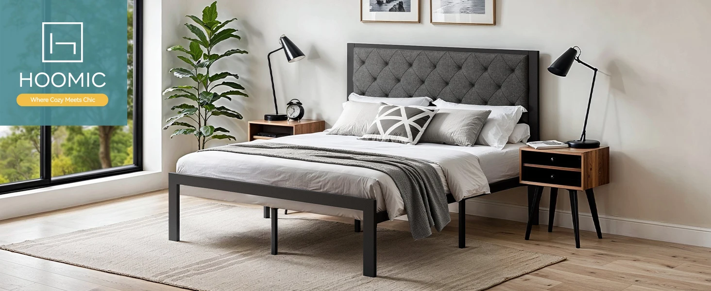 HOOMIC Metal Bed Frame with Upholstered Finely Stitched Headboard, Linen Fabric, Sturdy Foundation, No Box Spring Needed