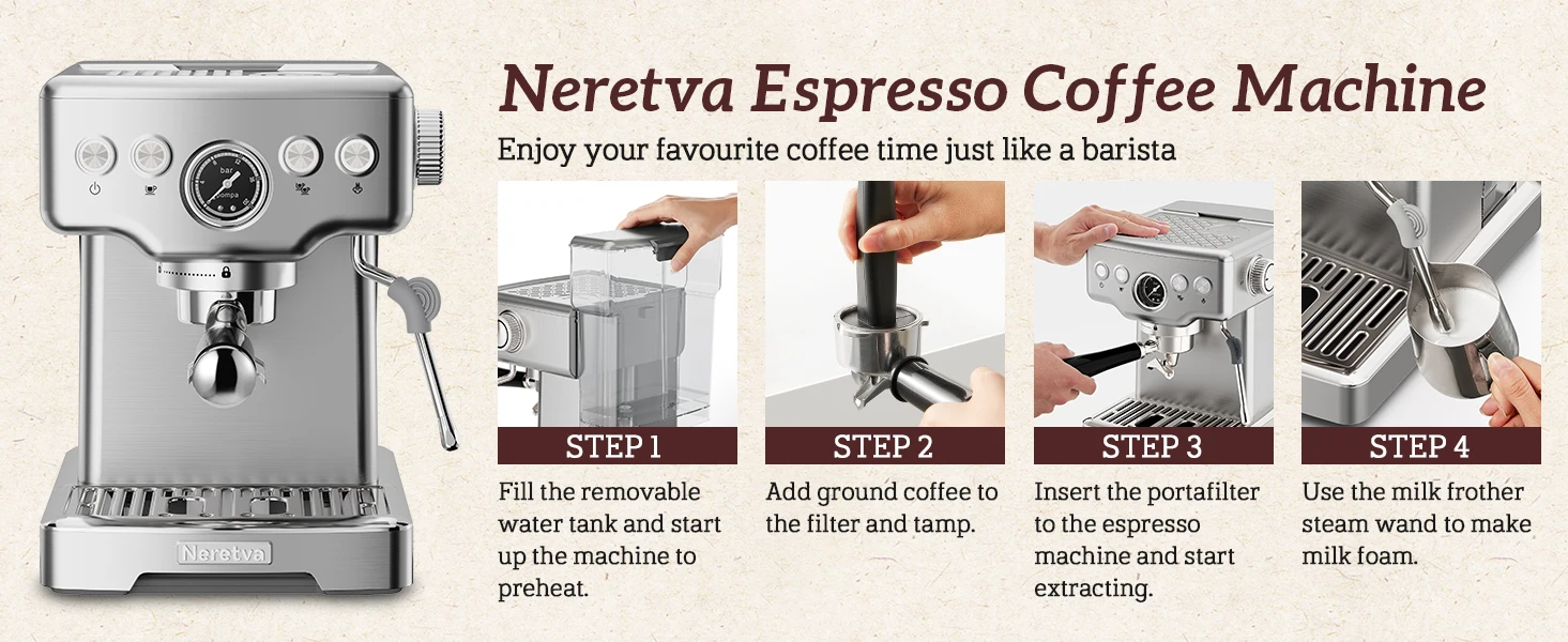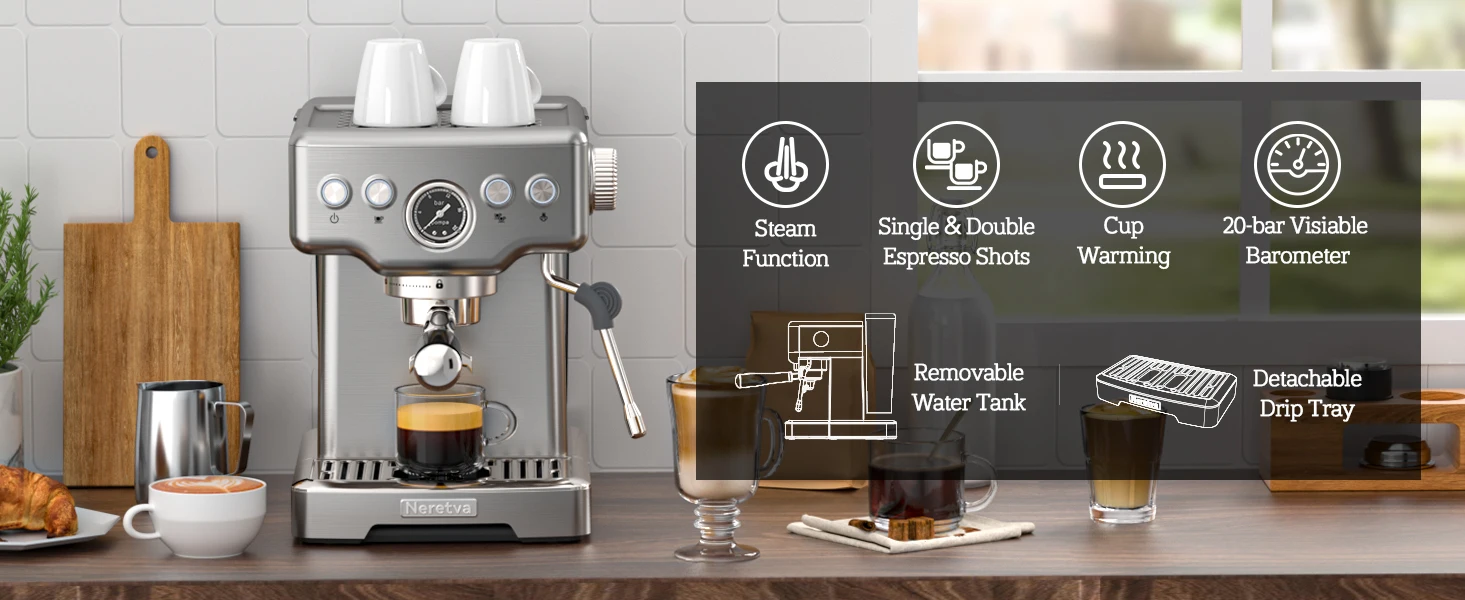 High-Quality Service - Neretva provides creativity and aesthetics for our products. We care about each customer's experience and satisfaction! If we can assist in any way, please don't hesitate to contact us. We want you to buy our cafetera espresso with confidence; We offer 12-hour quick-response customer service. | WHAT YOU WILL GET? - espresso machines, portafilter, 2 filters, coffee spoon, dosing funnel, milk frothing pitcher and user manual.