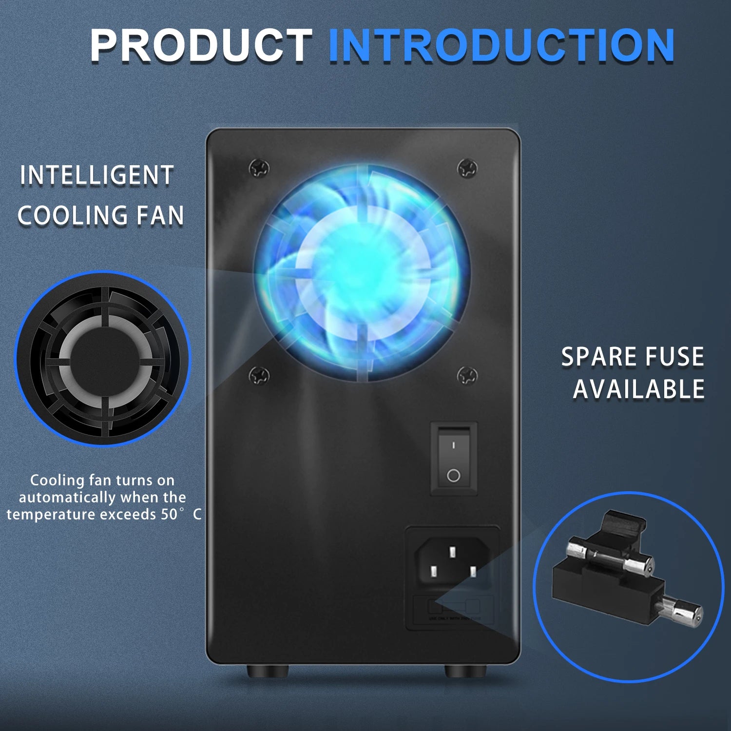 Intelligent Cooling Fan: Low noise; low consumption; When the temperature reaches 50°C the fan will automatically turn on.