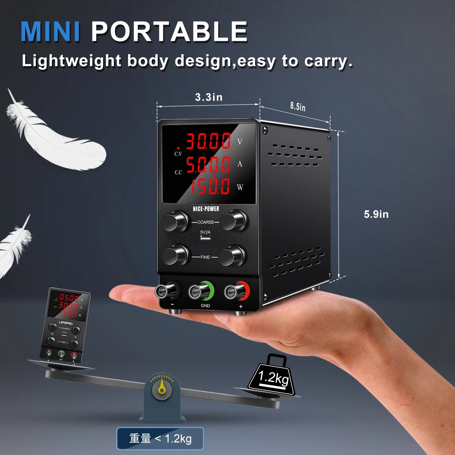 【Stable Vertical Design, Lightweight and Portable】Bench power supply adopts stable vertical design, DC power supply has shock absorber rubber feet at the bottom, so it will be safer and more stable during use. DC power supply is very light and portable, with a size of only 3.3 x 9.4 x 6.1 inches and a weight of only 2.6 pounds. You can easily take the DC power supply to work.