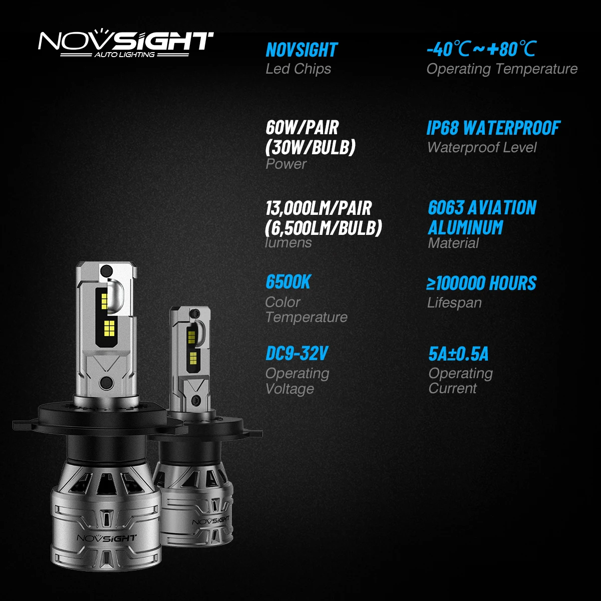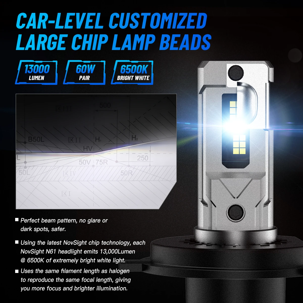 NOVSIGHT N61 Series Car Headlight Bulbs 9005 9006 9012 H1 H11 H3 H4 H7 13000LM 60W 6500K Built-in Fan Design