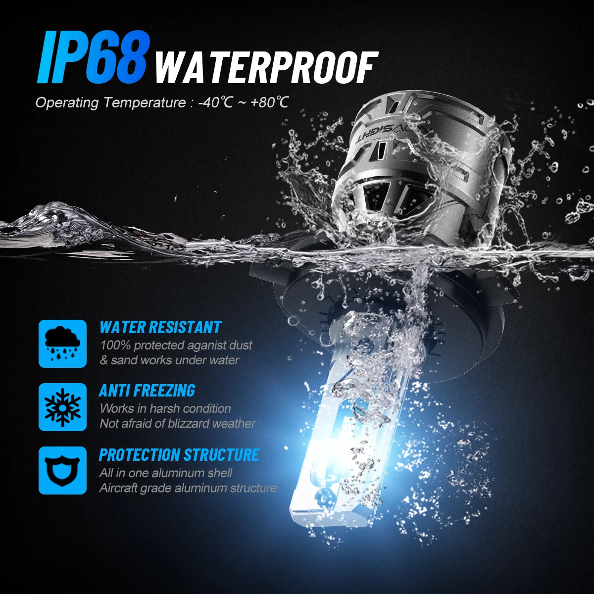 【20 Years Lifespan】---IP68 waterproof makes it work normally in extreme conditions such as fog, rain, snow and so on. Built-in high-speed powerful noiseless fan, aviation aluminum lamp body, effectively cooling led bulbs, avoid overheating damage, while still allowing you to enjoy a quiet and comfortable driving environment. More than 100,000 hours of service life, keep your light always running at optimal brightness