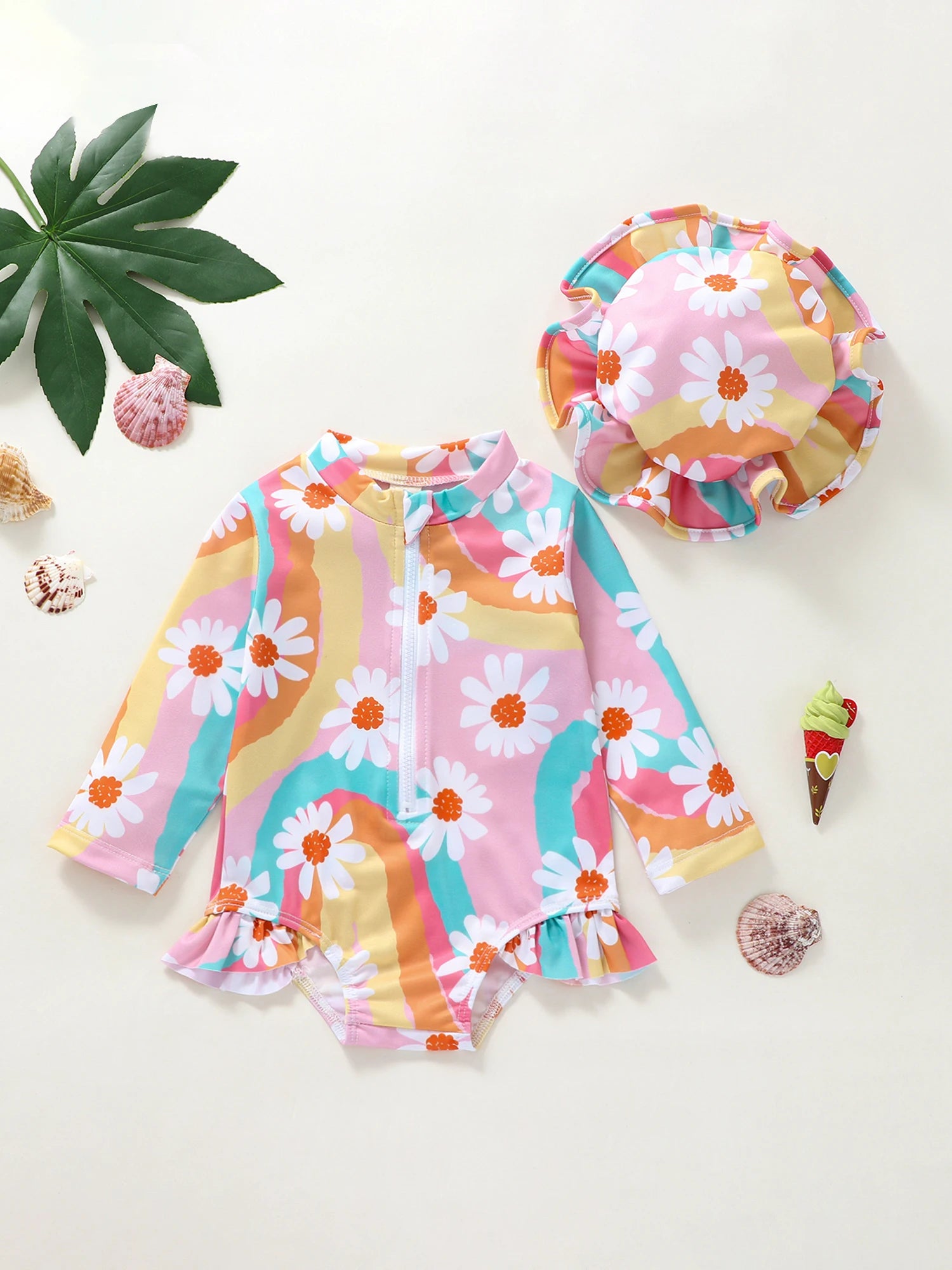 Toddler Boy Rash Guard Swimsuit Short Sleeve High Neck Zipper Beach Pool Bodysuit Swimwear Cap