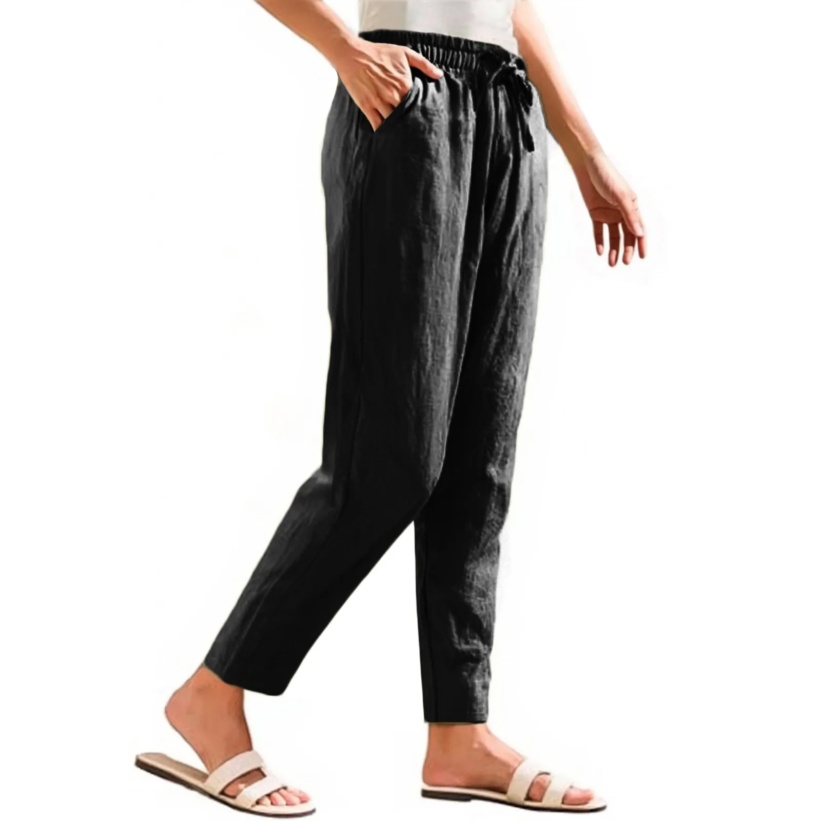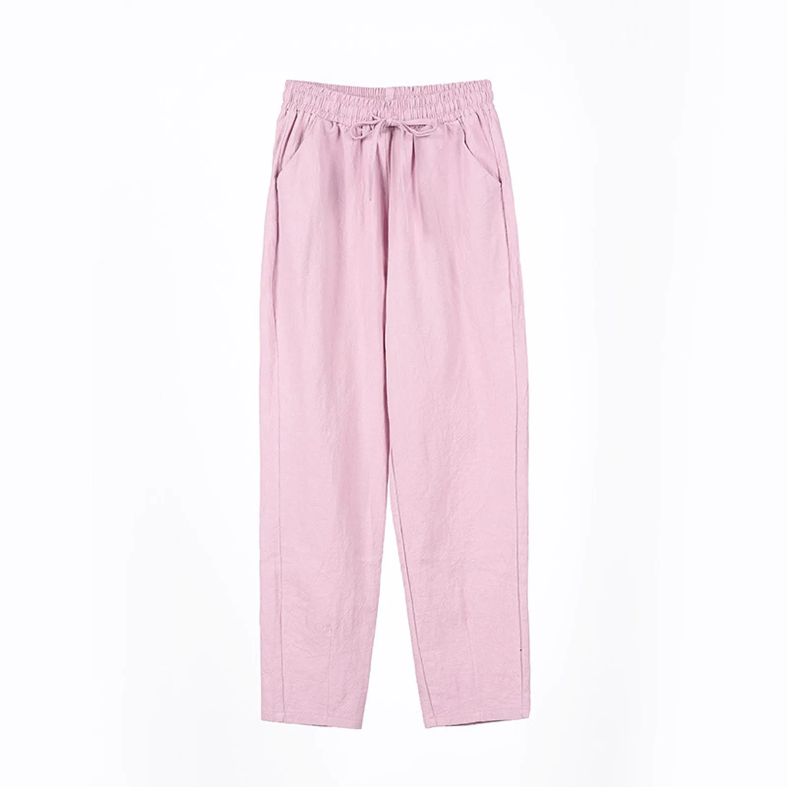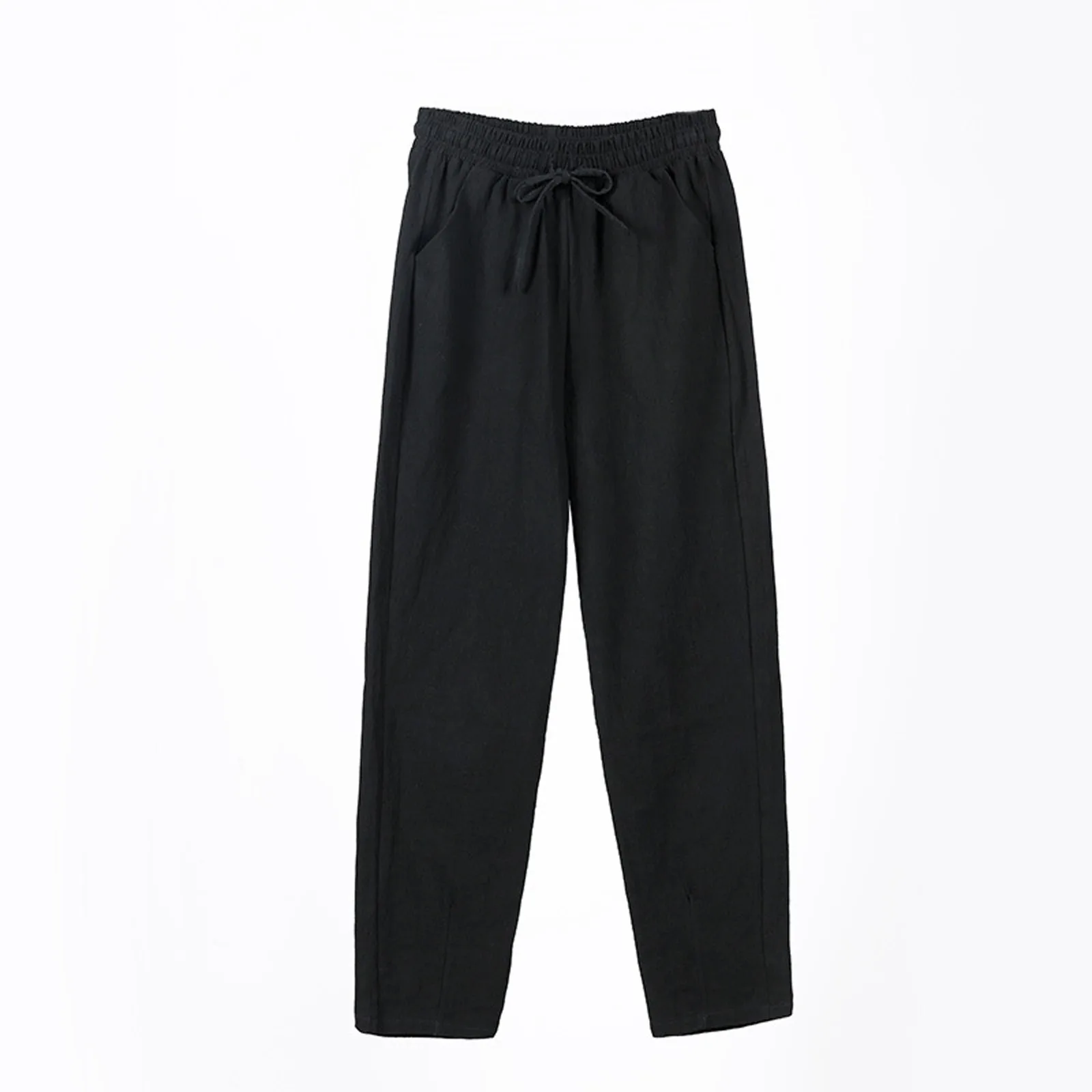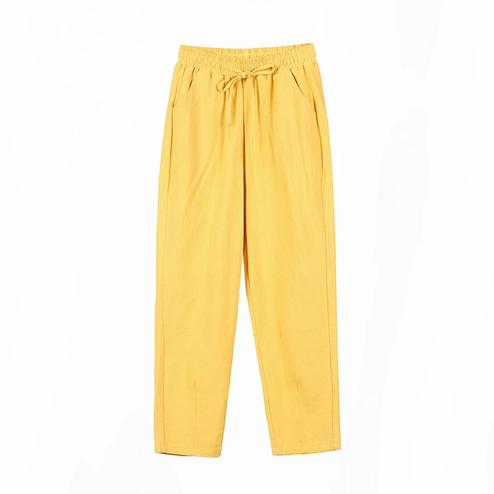 Women Cropped Pants Cotton Linen Baggy Trousers Drawstring Elastic Waist Pantalones Korean Fashion Solid Straight Pants штаны