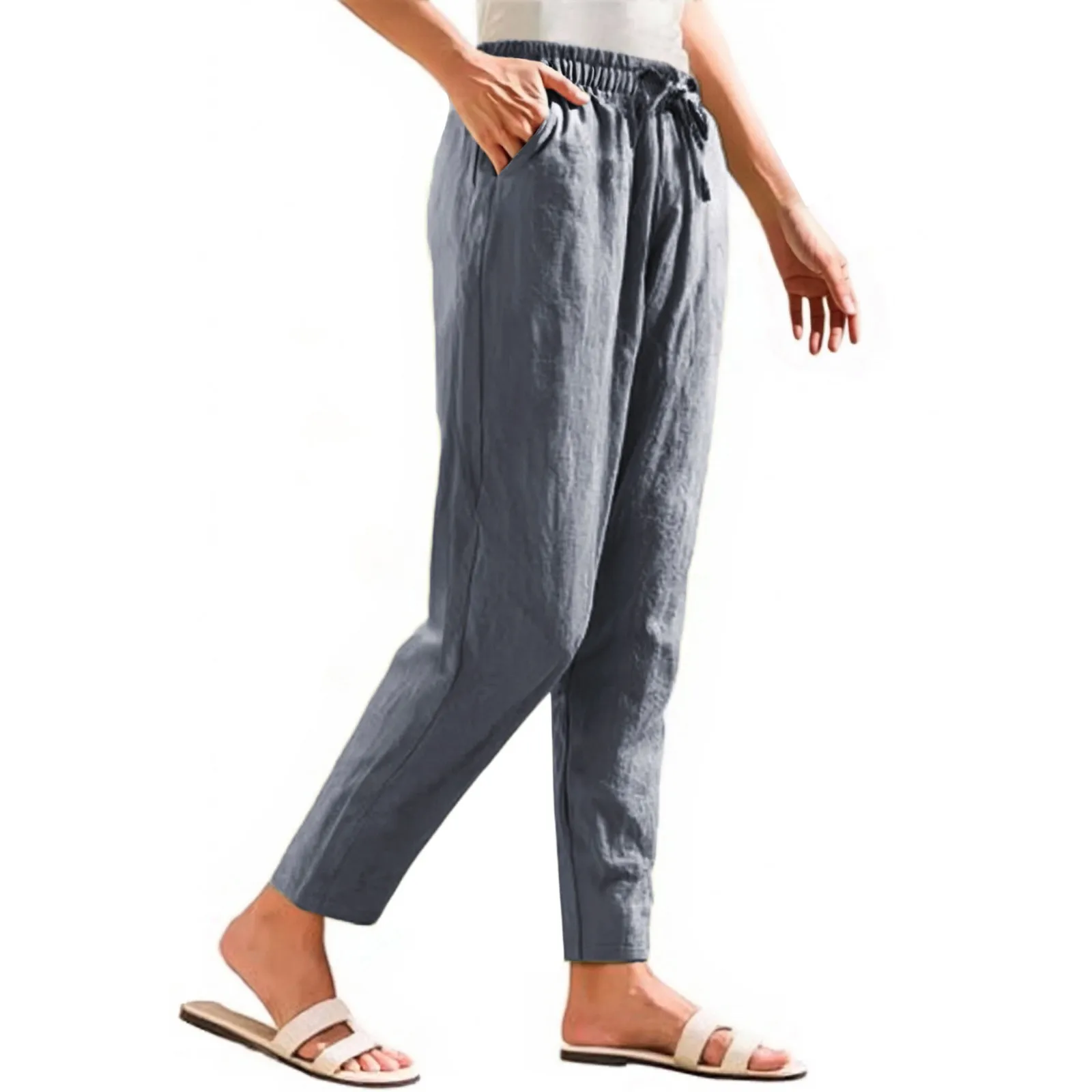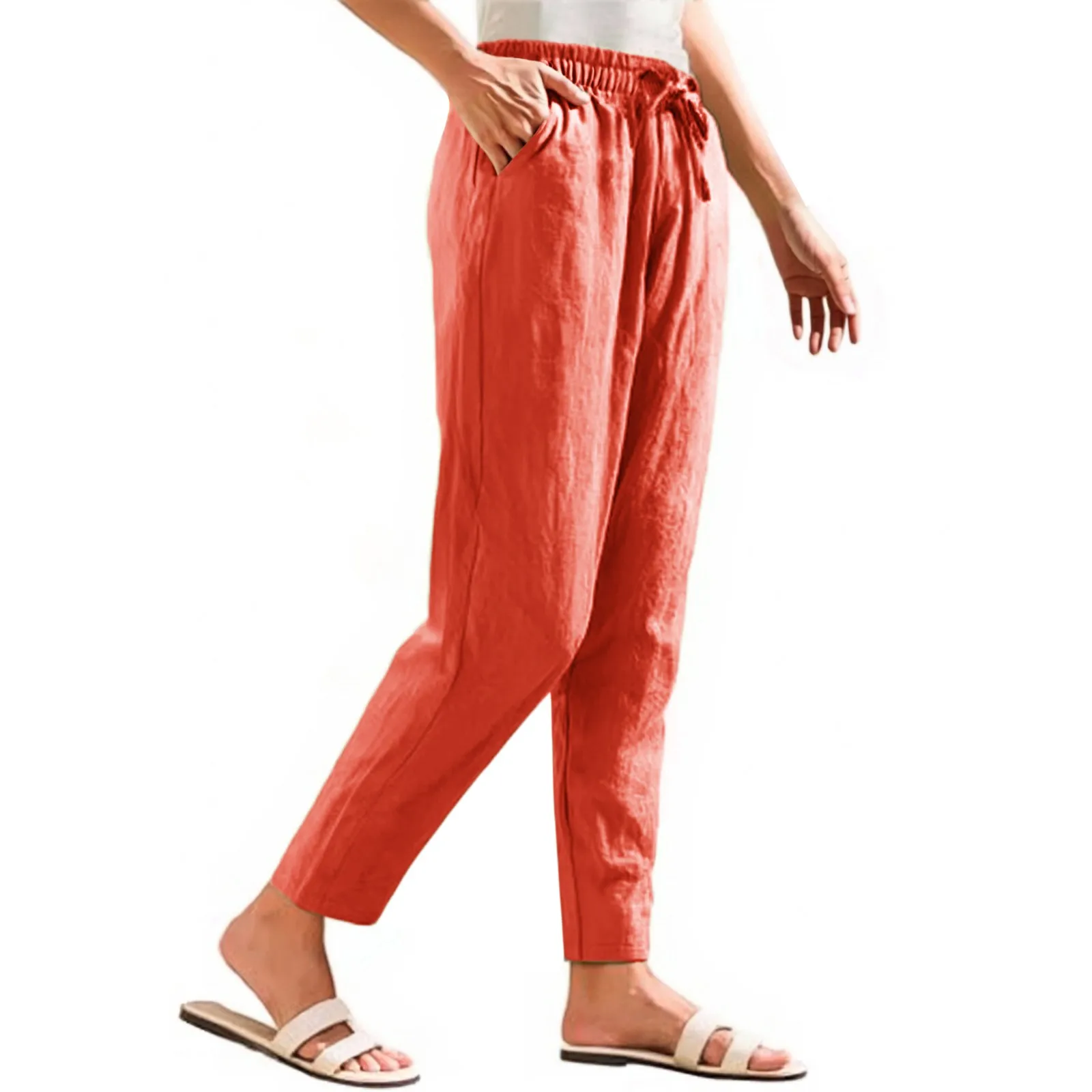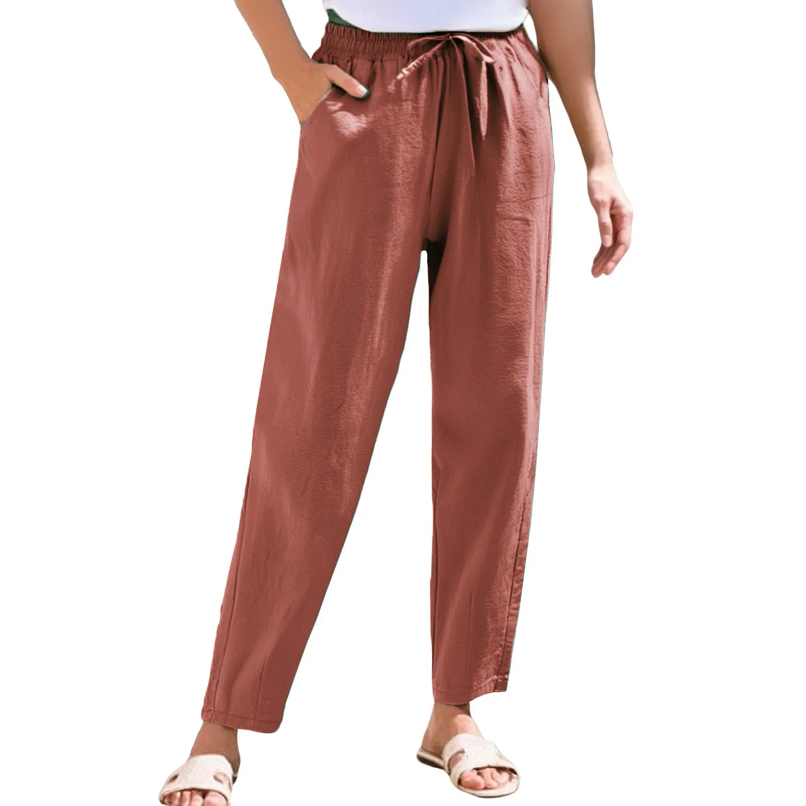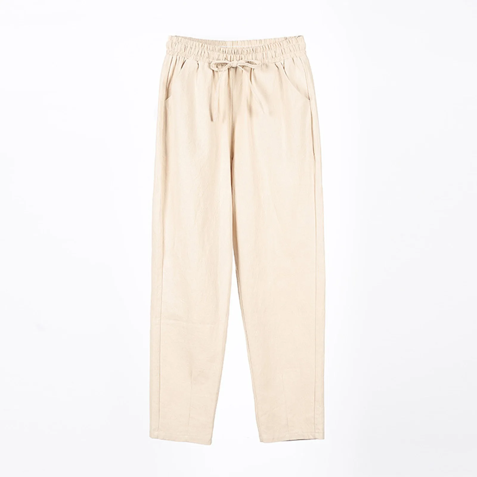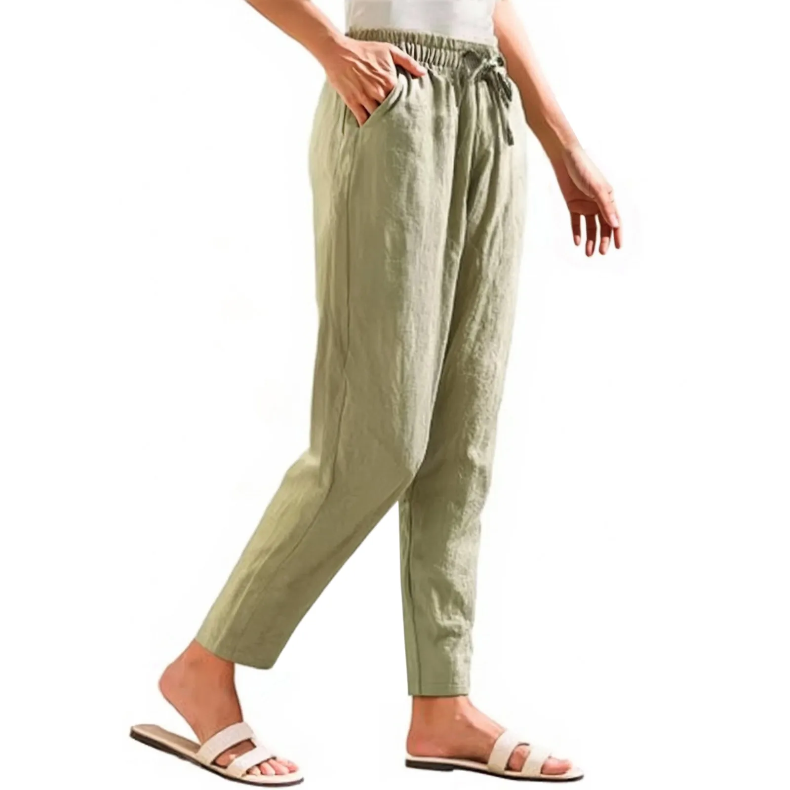 Women Cropped Pants Cotton Linen Baggy Trousers Drawstring Elastic Waist Pantalones Korean Fashion Solid Straight Pants штаны
