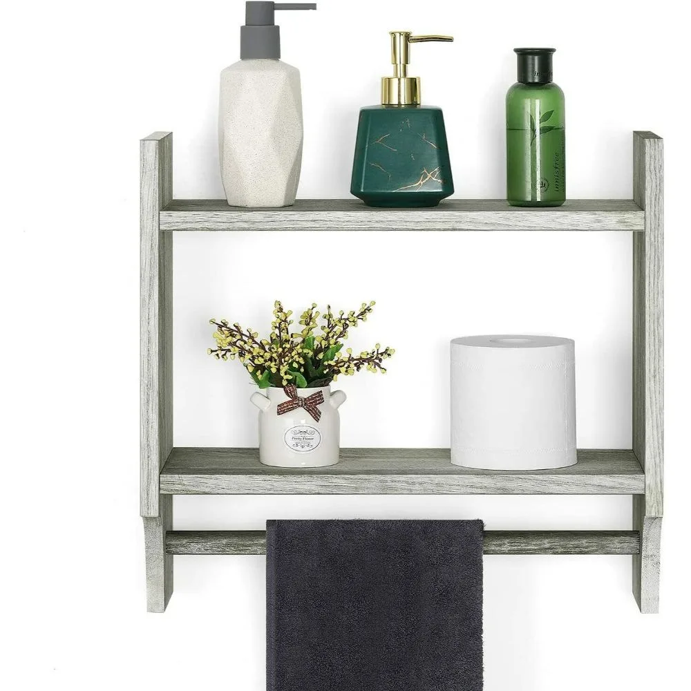 This bathroom storage rack is installed on the wall, providing additional storage space; The upper double-layer storage rack can be used to store roll paper, toiletries, or decorations, while the lower storage bar is used to hang bath towels.